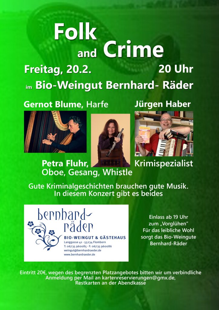 Ein besonderer Konzertabend mit Jürgen Haber, Petra Fluhr und Gernot Blume: Spannende Kriminalgeschichten treffen auf traditionelle Folk-Musik.